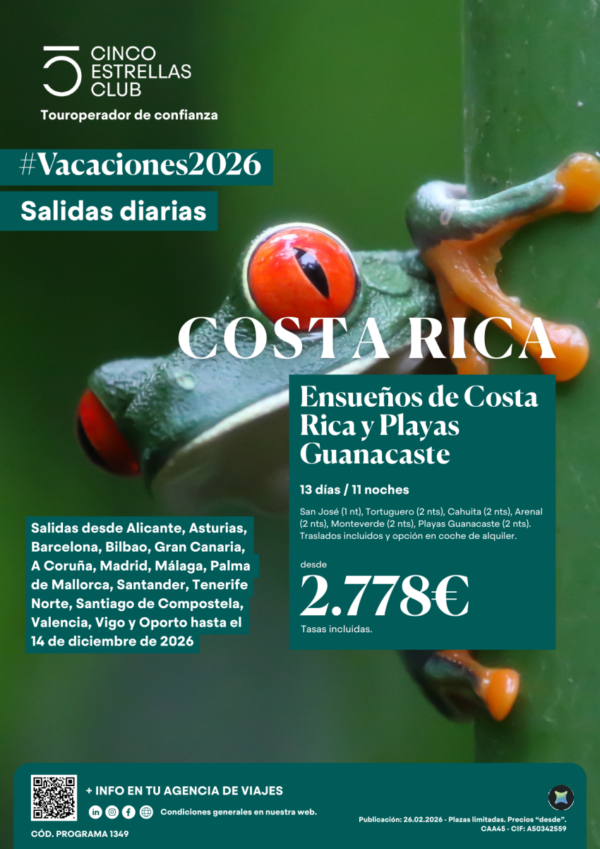 Ensueños de Costa Rica y playas Guanacaste 13ds/11ns dsd 2.778€ sall diarias hasta dic'26 ver aerop. salidas